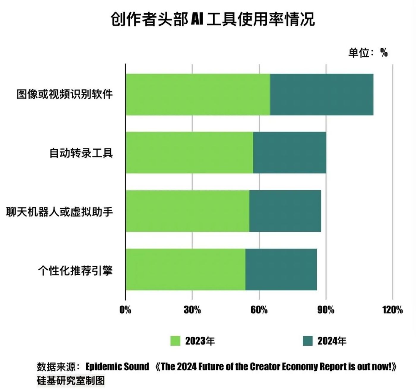 在Epidemic Sound 调查的1500名内容创作者中,尽管有84%的内容创作者表示他们正在利用AI工具和应用辅助内容创作,但他们对头部AI工具的使用率却在逐年下降。