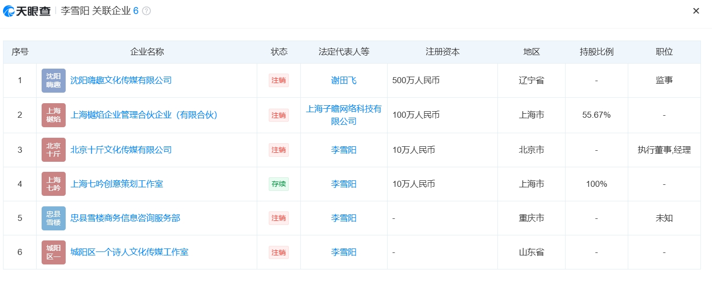 每日经济新闻综合自李雪琴工作室微博、大象新闻、红星新闻、天眼查