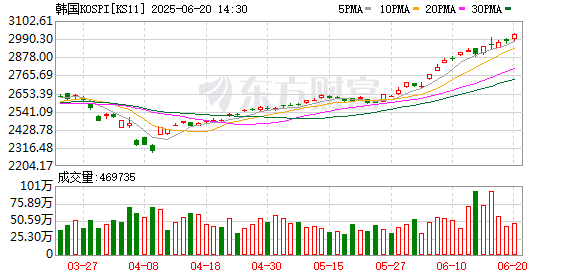 6月20日,韩国股市再度走强。截至收盘,韩国综合指数(KOSPI)上涨1.48%,报3021.84点,自2022年1月以来首次突破3000点大关。科技股集体大涨,Kakao涨超10%,LG CNS涨超9%,Naver涨近7%,SK海力士涨超4%。