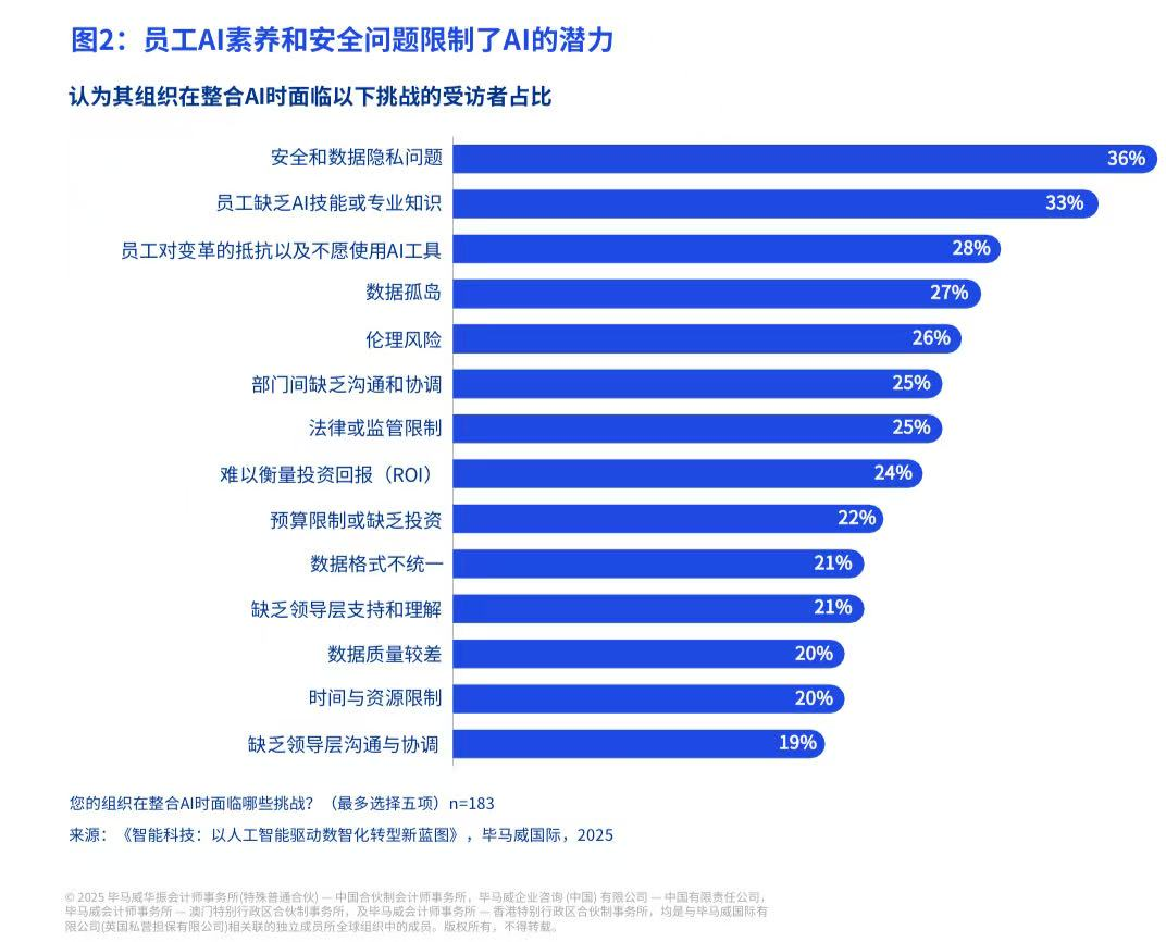 然而,这条转型之路并非坦途。报告同样揭示了普遍存在的挑战,其中,人才技能的短缺与数据安全隐私的担忧,是目前阻碍企业释放AI全部潜力的两大核心障碍。