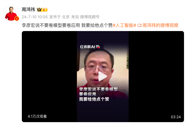 不过,周鸿祎在今天发布的这则点赞李彦宏的视频中,没有谈论大模型开源闭源的问题。