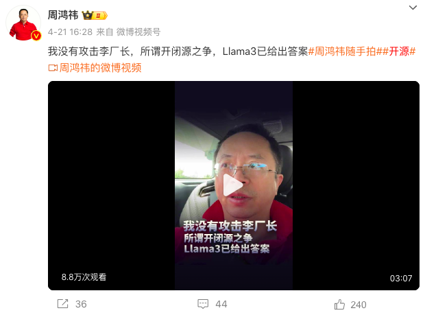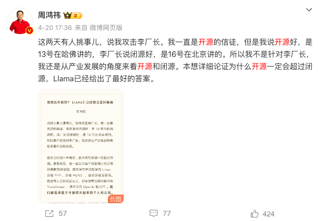 以至于在今年4月20日、21日,周鸿祎还连发长文、视频表示:“这两天有人挑事儿,说我攻击李厂长。我一直是开源的信徒,但是我说开源好,是13 号在哈佛讲的,李厂长说闭源好,是 16号在北京讲的。所以我不是针对李厂长,我还是从产业发展的角度来看开源和闭源。”