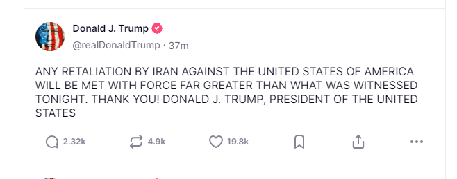 而在他讲话结束后不久,他又发帖警告称,“伊朗对美国的任何报复,都将遭到远超今晚所见的强硬回击。”