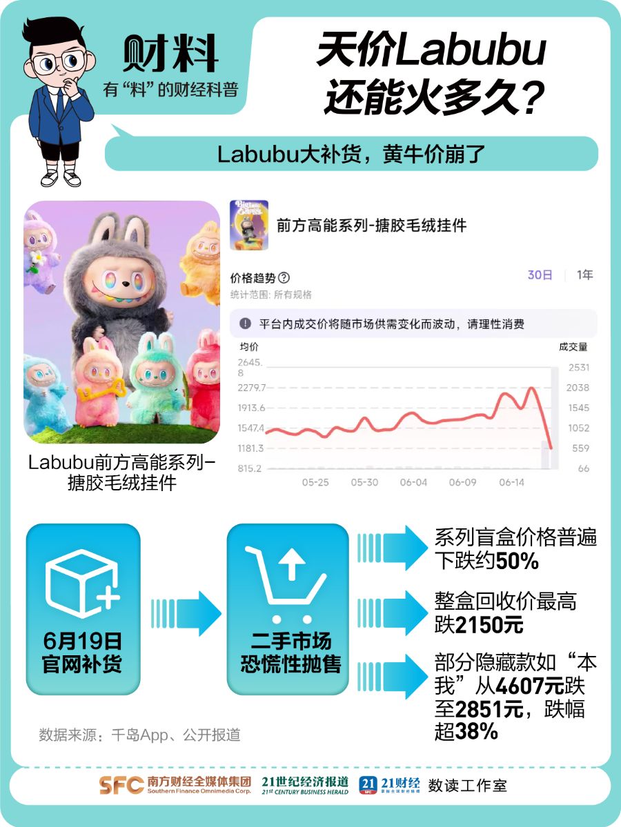 6月19日,Labubu官方突然大补货,让黄牛们措手不及。热门系列价格普遍腰斩,部分隐藏款价格缩水近四成,整盒回收价最高狂跌2150元。