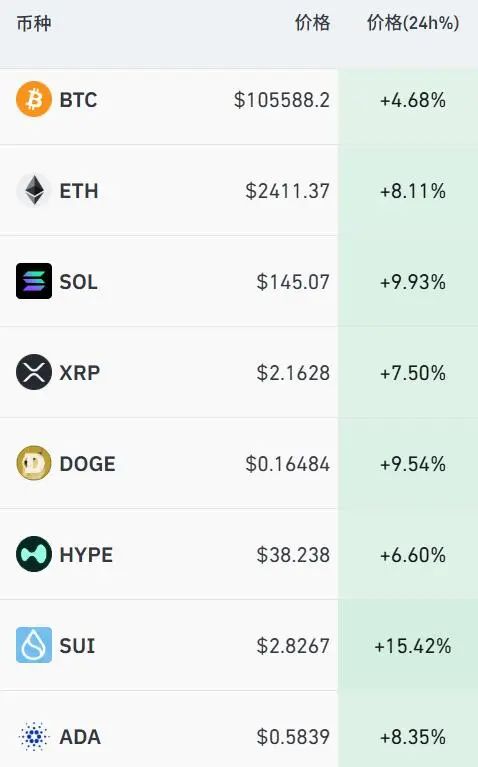 加密货币市场全线大涨,比特币向上升破105000美元,日内涨超4%。以太坊站上2400美元,日内涨超8%。最近24小时,全球共有超13万人爆仓。