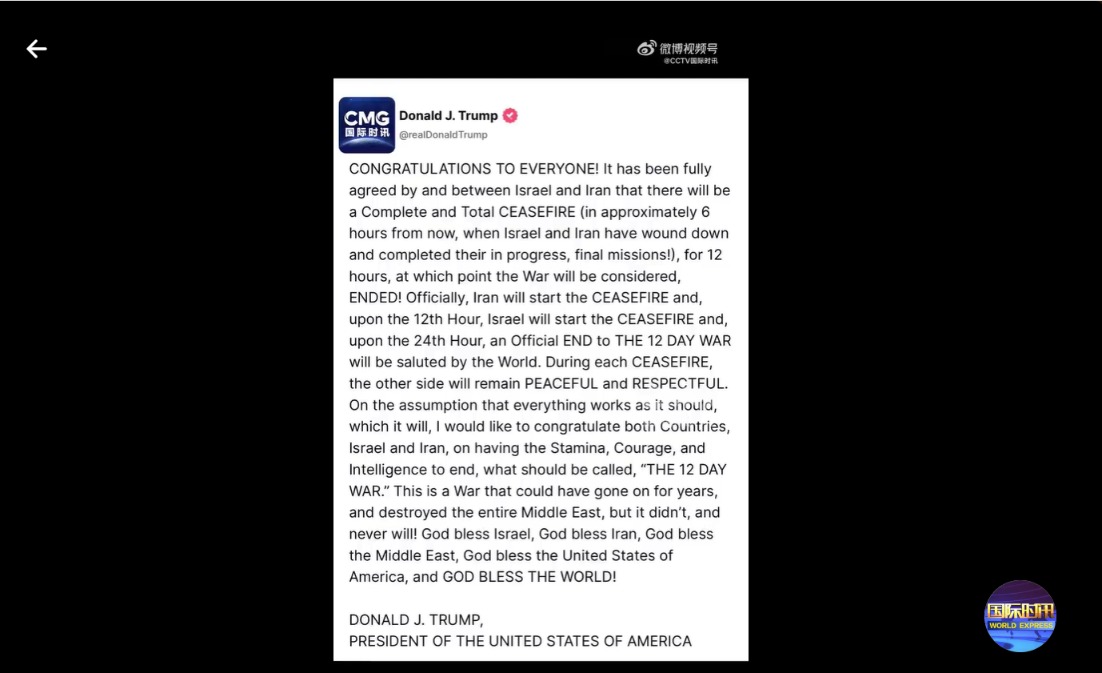 特朗普发文时间为美国东部时间23日18时,特朗普称,双方停火将于大约6小时后开始,也就是美国东部时间24日零时。停火协议涉及两个12小时的停火期,伊朗将启动首个12小时停火,以色列将随后进行第二个12小时停火,24小时后,战争将正式宣布结束。
