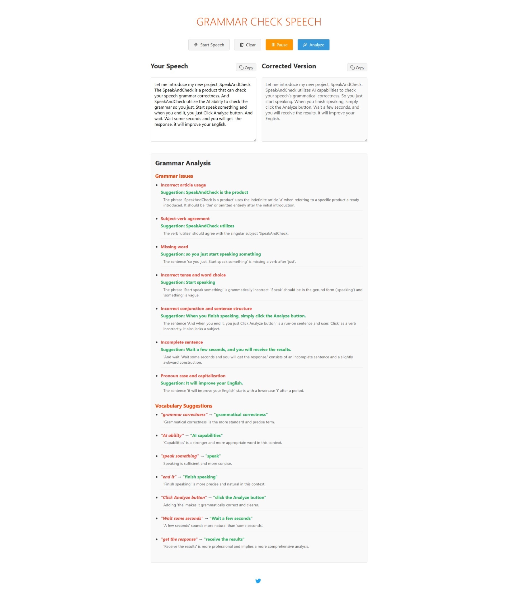 它背后由 AI 驱动,核心思路非常简单:你只需要说一段英文,它就能帮你智能分析,给你语法的分析和词汇的建议。目前支持的语言是英文和中文。使用 chrome 和 edge 浏览器的识别效果非常好。