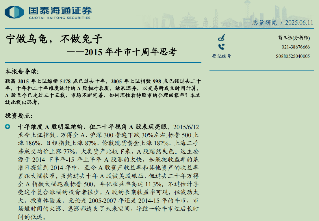 截至目前,荀玉根最新署名研报的发布时间为今年6月11日。当天,他发布研报《宁做乌龟,不做兔子——2015年牛市十周年思考》,而且这份研报仅有他一人署名。