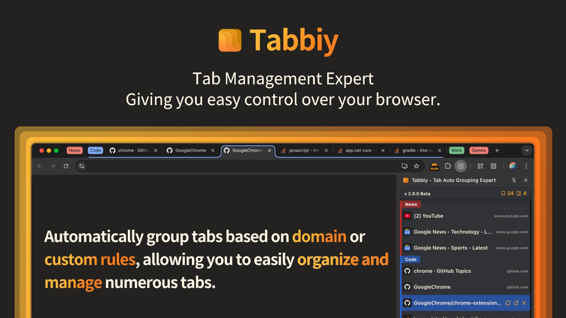 大家好,我们团队开发了一个工具,可以自动地将浏览器标签页按照自定义的规则分组,明确的分类,让我的标签页看起来不再那么乱七八糟了。在过去的工作中,我的浏览器打开了一大堆的标签页,查找起来特别的麻烦,密密麻麻的让人很不舒服,导致我的工作效率低下。我留意到有很多人也遇到了像我一样的烦恼,于是,我开发了这个工具,给标签栏节省了大量的空间,查找标签页非常方便,希望能够帮助到大家。