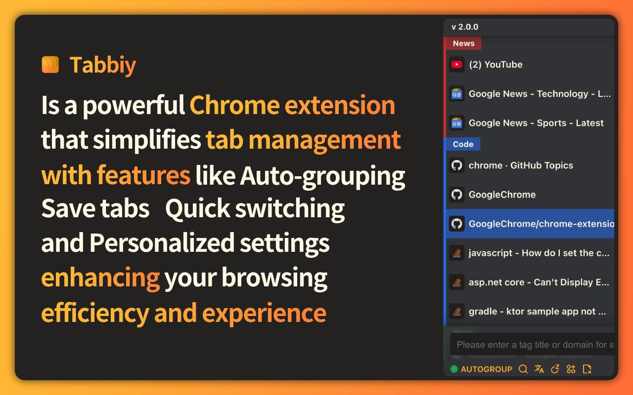 朋友们,别再忍受标签页带来的混乱和低效了,试试 Tabbiy,让你的浏览器使用体验焕然一新。Tabbiy 是免费的。如果你喜欢它,请给 Tabbiy 打分,也欢迎给我提一些建议和意见,我特别期待能和大家一起把 Tabbiy 变得更完美!