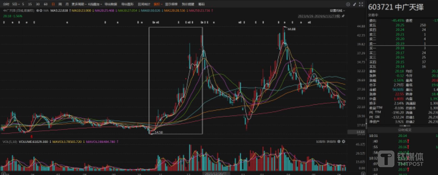 与不乐观的业绩相比,近年来公司股价在二级市场上表现却颇为亮眼。2023年年底,“短剧”概念横空出世,让与之相关的传媒上市公司股价迎来高光。其中,中广天择股价表现最为抢眼,2个月(即2023年10月24日-12月20日)股价累计涨幅超150%。