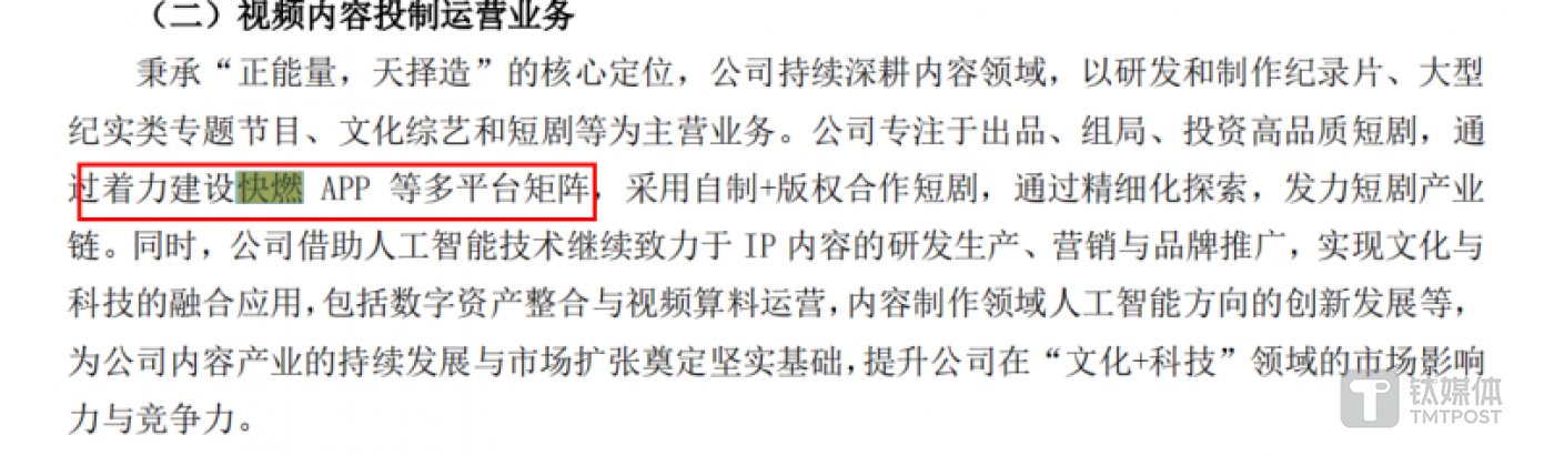 自《完蛋!美女》爆火后,中广天择立马制作一部名为《完蛋!我被帅哥包围了!》的短剧,从此挂上了“短剧”概念,并且公司还宣称将打造了一款短剧业务“快燃”APP,用于发力短剧产业链。