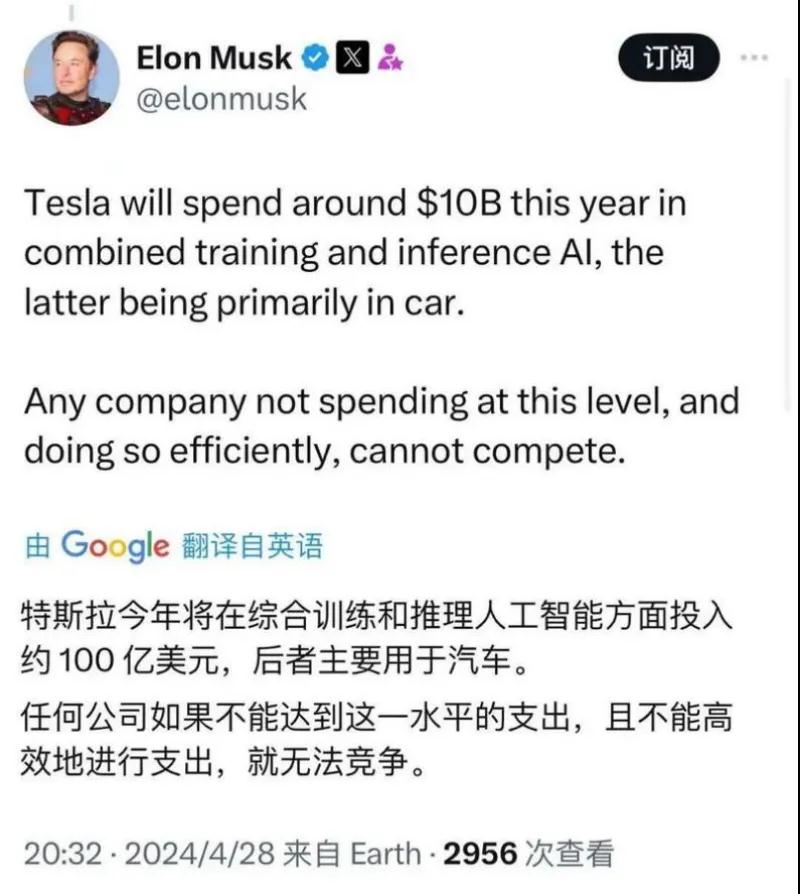 但端到端对自动驾驶来说,可能是“有效解法”,但却不一定是“最佳解法”。马斯克曾发文表示,特斯拉今年将在综合训练和推理人工智能方面(主要用于汽车)投入约100亿美元,任何公司如果不能达到这一水平的支出,且不能高效地进行支出,就无法竞争。