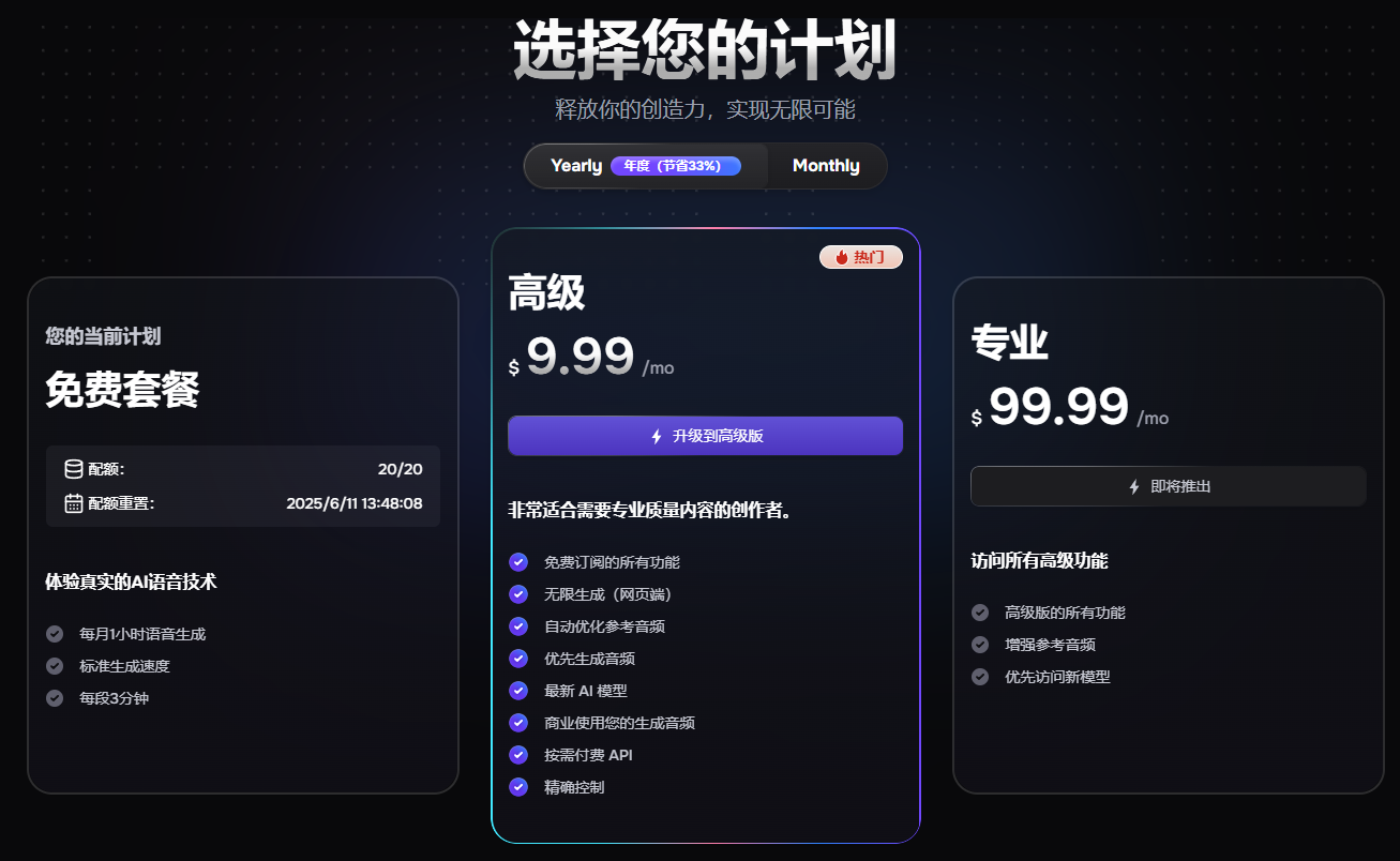 价格上,免费额度每个月有一个小时的额度,会员是 $9.9 每个月且无限生成。