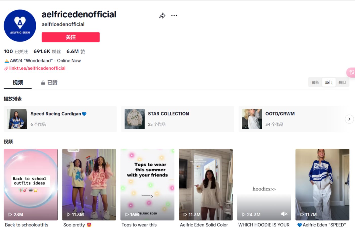 其次在达人合作上,Aelfric Eden有着非常全面的KOL布局策略,Aelfric Eden不定期地与大量达人进行合作,且选择的达人调性与品牌有比较高的契合度。2023年统计的数据显示,Aelfric Eden在TikTok上的相关视频播放量超过了8亿。