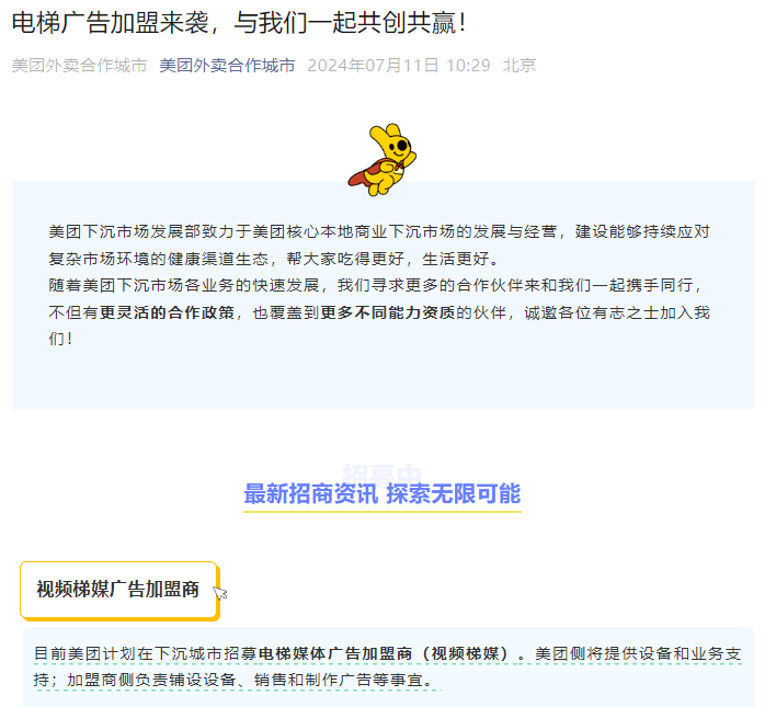 微信公众号“美团外卖合作城市”发文称,目前美团计划在下沉城市招募电梯媒体广告加盟商(视频梯媒)。美团侧将提供设备和业务支持;加盟商侧负责铺设设备、销售和制作广告等事宜。