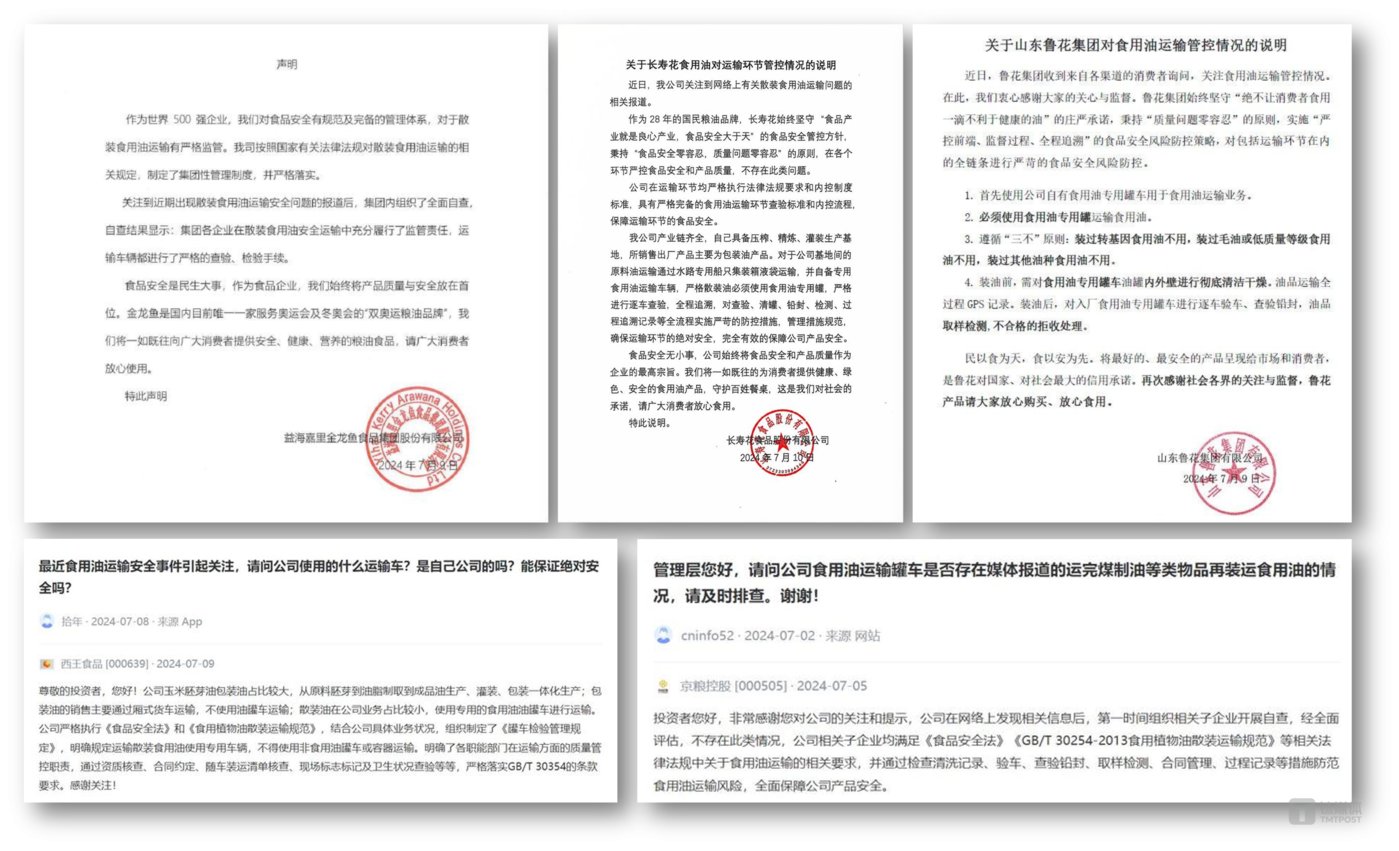 一些食用油公司怕牵涉其中,也纷纷进行了回应。鲁花集团发布声明回应称,首先使用公司自有食用油专用罐车用于食用油运输业务,必须使用食用油专用罐运输食用油,遵循“三不”原则。