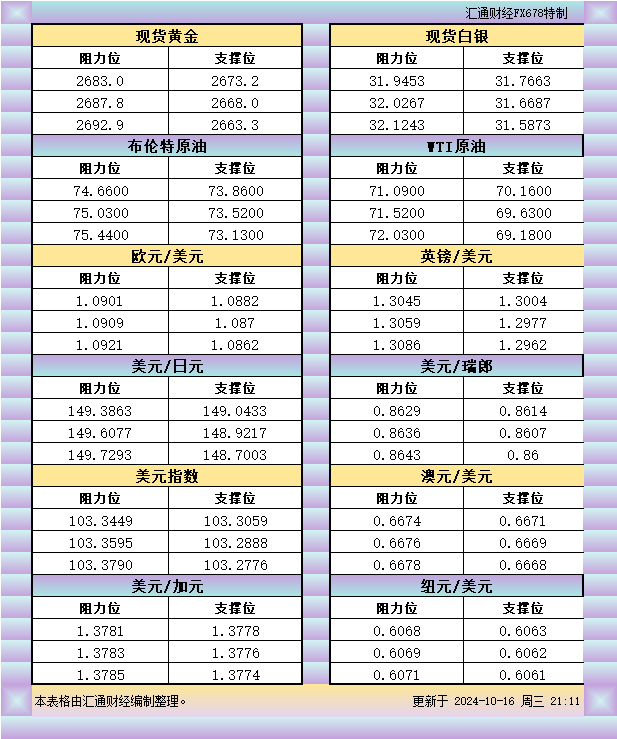 Home贵金属10月16日美市支撑阻力:金银原油+美元指数等八大货币对 贵金属 2025 年 6 月 30 日 10月16日美市支撑阻力:金银原油+美元指数等八大货币对 By 古方信息网 - Advertisement - 文章来源:汇通网 10月16日美市黄金、白银、原油、美元指数、欧元、英镑、日元、瑞郎、澳元、加元、纽元支撑阻力位一览。 - Advertisement - Must Read 24小时 传说中的武器来了!最新一代电磁枪威力巨大 古方信息网 - 2026 年 4 月 5 日 - Advertisement - 贵金属 超级周来袭:央行决议、数据洪流中的全球市场机遇与风险 2026 年 4 月 5 日 股票 伊朗公布最新战果! 2026 年 4 月 5 日 24小时 中国机车海外夺冠 张雪为什么突然火了? 2026 年 4 月 5 日 Related News 24小时 传说中的武器来了!最新一代电磁枪威力巨大 2026 年 4 月 5 日 贵金属 超级周来袭:央行决议、数据洪流中的全球市场机遇与风险 2026 年 4 月 5 日 股票 伊朗公布最新战果! 2026 年 4 月 5 日 24小时 中国机车海外夺冠 张雪为什么突然火了? 2026 年 4 月 5 日 期货 美军飞行员被俘怎么办?特朗普:希望“那种情况”不会发生 2026 年 4 月 5 日 - Advertisement -
