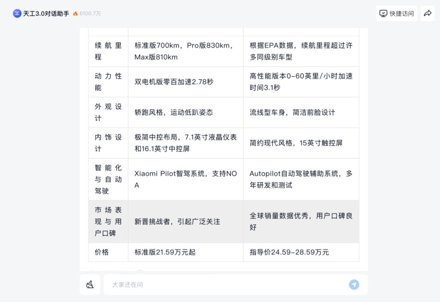 天工AI搜索提问“对比一下小米su7和特斯拉model3”所得出的结果