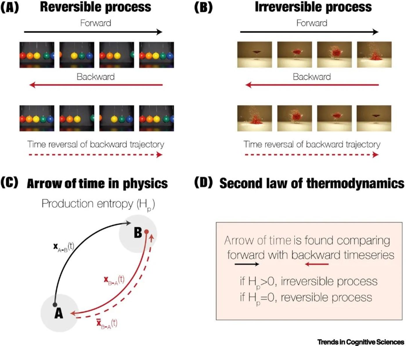 更笼统地说,不可逆性与熵的产生[71]密切相关。如图IC所示,它展示了一个具有AB两种状态的非平衡系统以及在与向前(A → B,黑色箭头)和向后(B → A,红色箭头)过程中演变的关联轨迹[72]。向前和向后的轨迹可以被认为是与前述子图中显示的影片片段相对应,但每个都有不同的时间之箭。相比之下,向后轨迹的时间反转(红色虚线箭头)可以想象为在时间上正向播放的向后轨迹的电影。如果向前和向后轨迹的时间反转是不同的,这对应了过程的不可逆性。最后,图1D用熵产生的概念展示了热力学的第二定律[23,36]。如果熵的产生Hp大于零,这对应了非平衡系统的不可逆性。相比之下,如果没有产生熵,即Hp = 0,那么这是一个可逆的平衡系统。