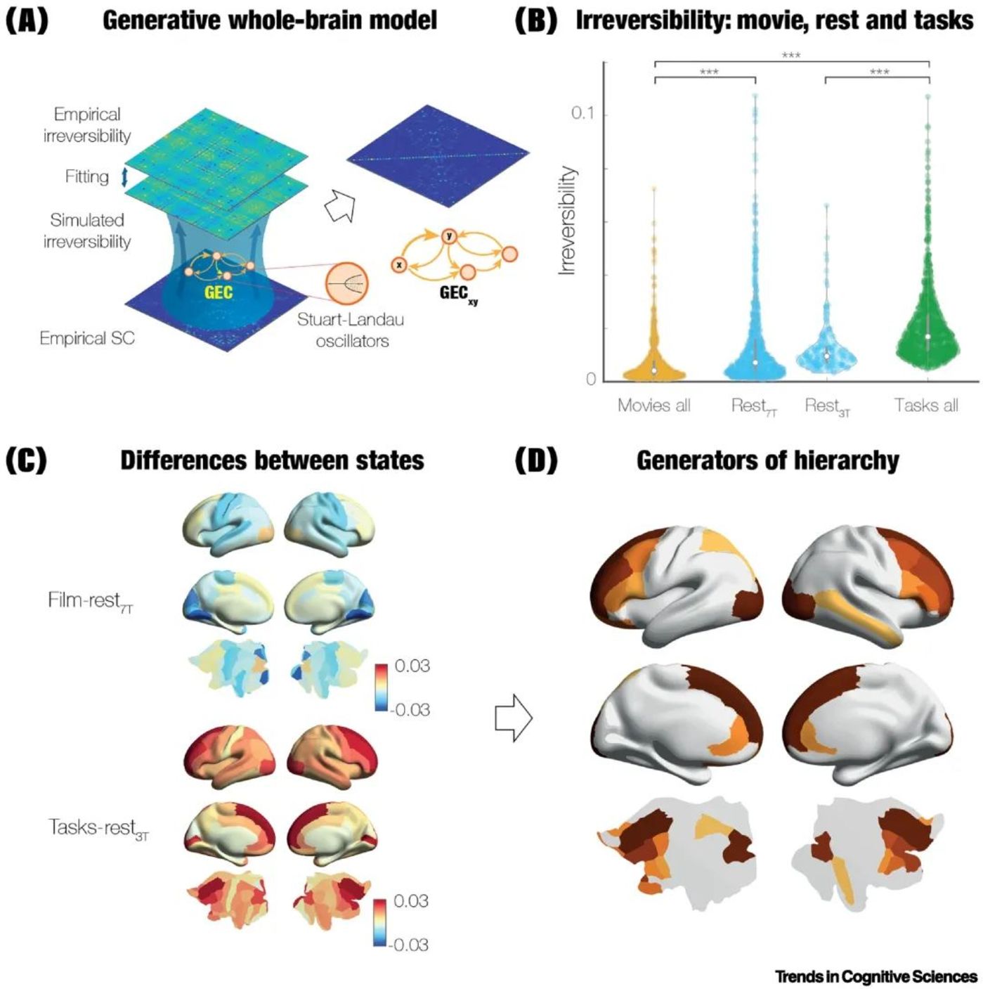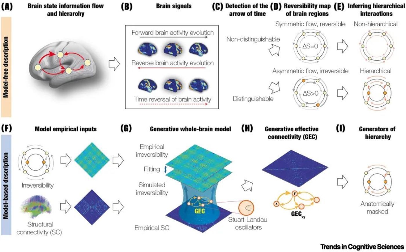 ▷图2:心智热力学的框架。图2描述了热力学原理如何通过量化信息流的不对称性来揭示大脑状态的层级结构。图2A中层级组织可以从信息流方向的不对称性中找到,这在热力学中被称为“打破细致平衡(breaking of the detailed balance)”。图2B展示不可逆性,即“时间之箭”,需要大脑信号的前向时间序列,以及反向时间序列(通过人为反转时间顺序)。图2C检测不可逆性需要区分这些前向和反向时间序列。图2D一个系统的不可逆性存在于两个极端情况之间:完全可逆且所有节点对称(顶部),或者不可逆,节点间的流动不对称导致细致平衡被打破(底部)。图2E就层级结构而言,这两个极端情况分别转化为不同的层级结构:均匀对称的流动导致平坦层级结构(顶部),而不对称的流动导致层级系统(顶部),其中两个橙色区域(在内部圆圈顶部)位于层级结构的顶部。因此,时间之箭为任何动力学系统提供了流动和层级结构的便利度量。图2F展示全脑建模可以用来识别功能层级的因果、产生机制。该模型整合了使用无模型基于解剖结构连接性的不可逆性估计量化和脑功能动力学。图2G,全脑模型使用局部动力学,例如,Stuart-Landau振荡器,来拟合真实场景中的不可逆性。图2H,优化导致最佳可能的有效连接产生。图2I,反过来,有效连接的产生提供了对产生给定大脑状态的生成机制的估计,可以使用的营养一致性(tropic coherence)来描述循环结构、稳定性和渗流。