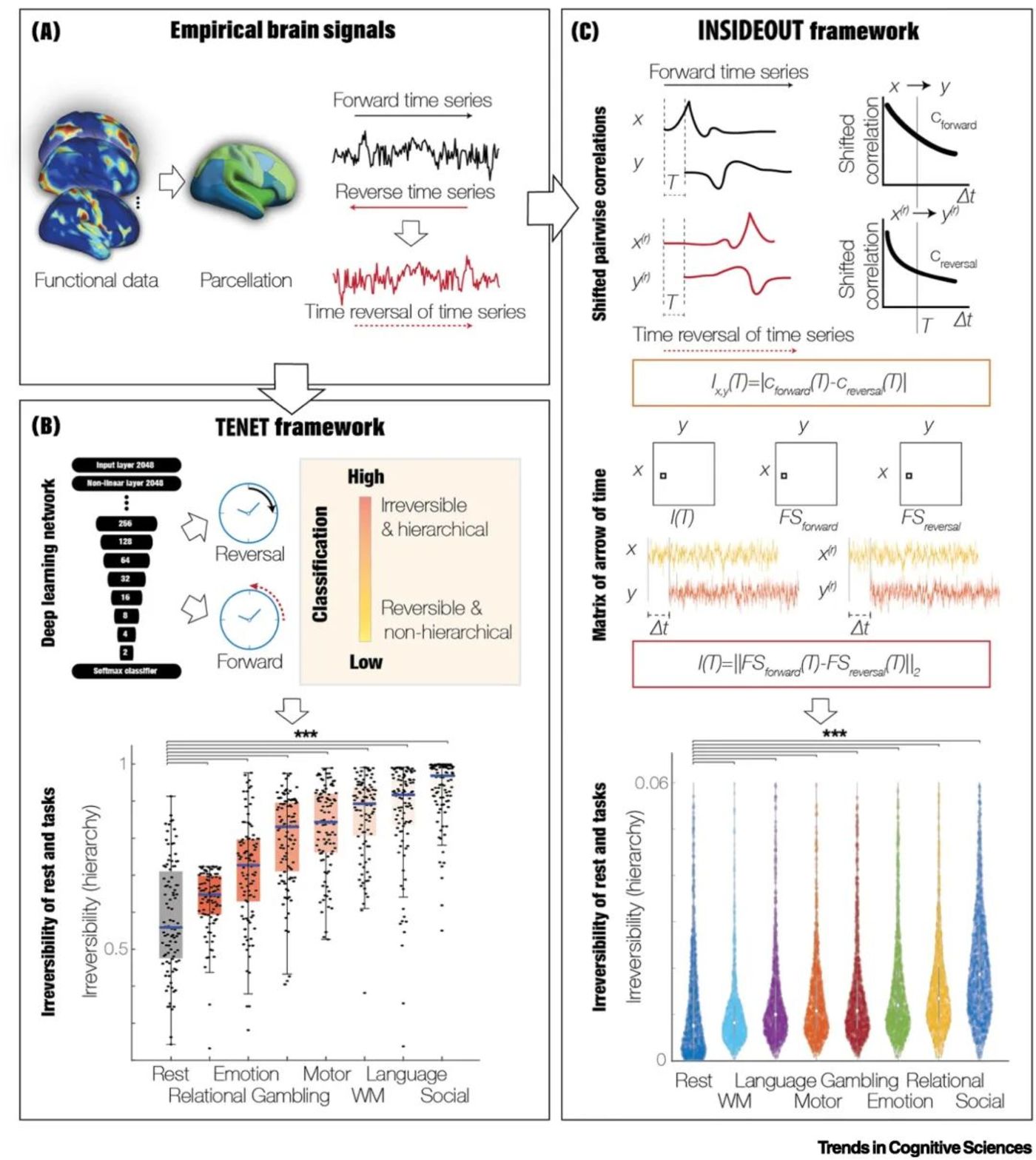 图3展示了心智的热力学框架的两个实例,可以在大脑中建立时间箭头并揭示大脑层级结构。(A)在不同脑区划分中提取大脑信号,生成前向和反向时间序列(通过人为反转时间顺序),然后用于衡量不可逆性。(B)对时间演化网络,使用深度学习,对这些时间序列进行训练,并在随后测试新数据时,分类性能提供了对网络不可逆性的衡量[38](上图)。使用在人类连接组项目的大规模神经成像数据上使用时间演化网络,对超过1000名参与者进行测试,结果显示静息状态的不可逆性和层级结构低于参与者执行七种认知任务时的状态(下图)。(C)类似地,INSIDEOUT框架也使用前向和反向时间序列来建立时间箭头信息流。该框架通过比较前向和反向时间序列之间的移位成对相关性来衡量不可逆性[39,40]。这些成对度量随后组合成一个完整的矩阵,从中可以建立层级结构。将INSIDEOUT方法应用于大规模人类连接组数据集,揭示了与使用时间演化网络分型类似的结果,即静息状态的不可逆性和层级结构低于执行七种任务时的状态。