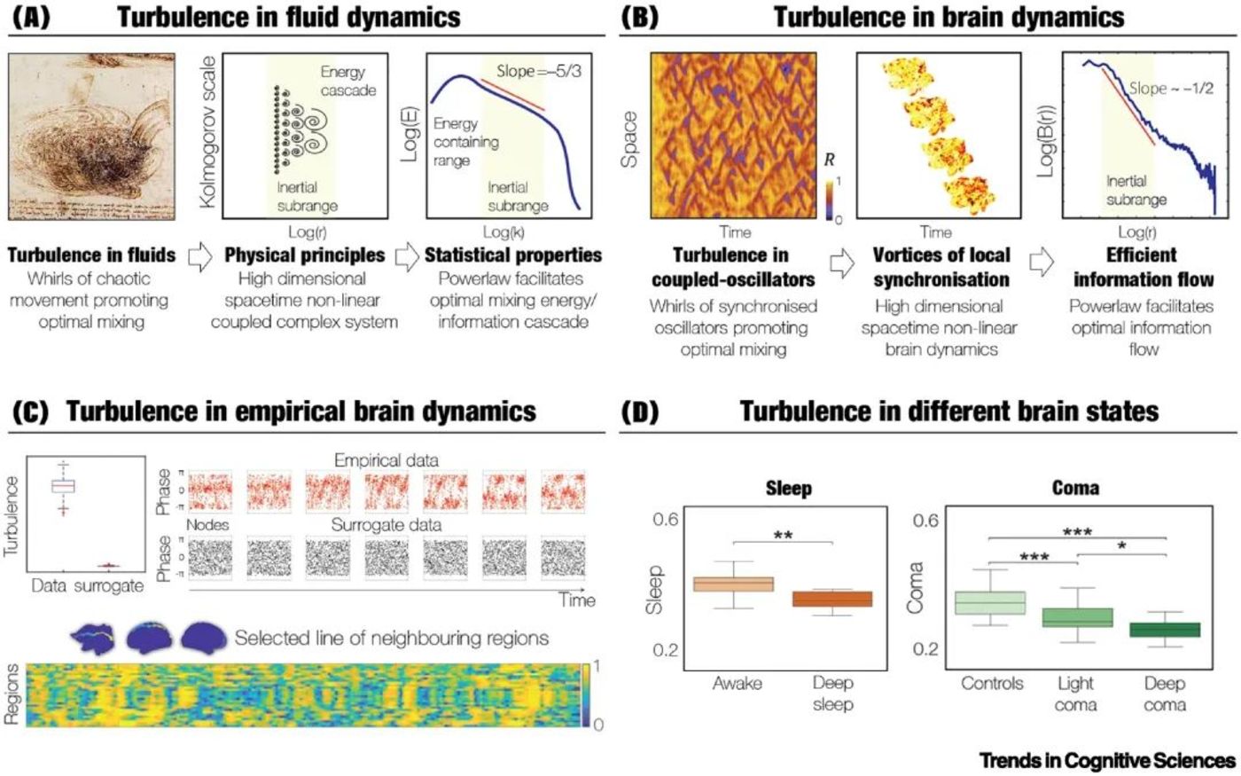 热力学可以为这个未解决的问题提供答案。最近的研究表明,答案在于湍流(turblence)(图5),这是一个远离平衡状态的不可逆动力学状态,显示出强烈的时间不对称性。最初由达芬奇命名为“turbolenza”[48],并由许多数学家进一步发展。湍流在自然界中无处不在,作为一种促进在时空尺度上有效能量和信息传递的基本动力学状态[49]。Andrey Kolmogorov通过在流体动力学中找到空间做功符合幂度定律证明了湍流的效率[50,51](图4A)。除了流体动力学领域,湍流也存在于其他物理系统中,包括耦合振荡器[52]和大脑[53,54](图4B,C)。