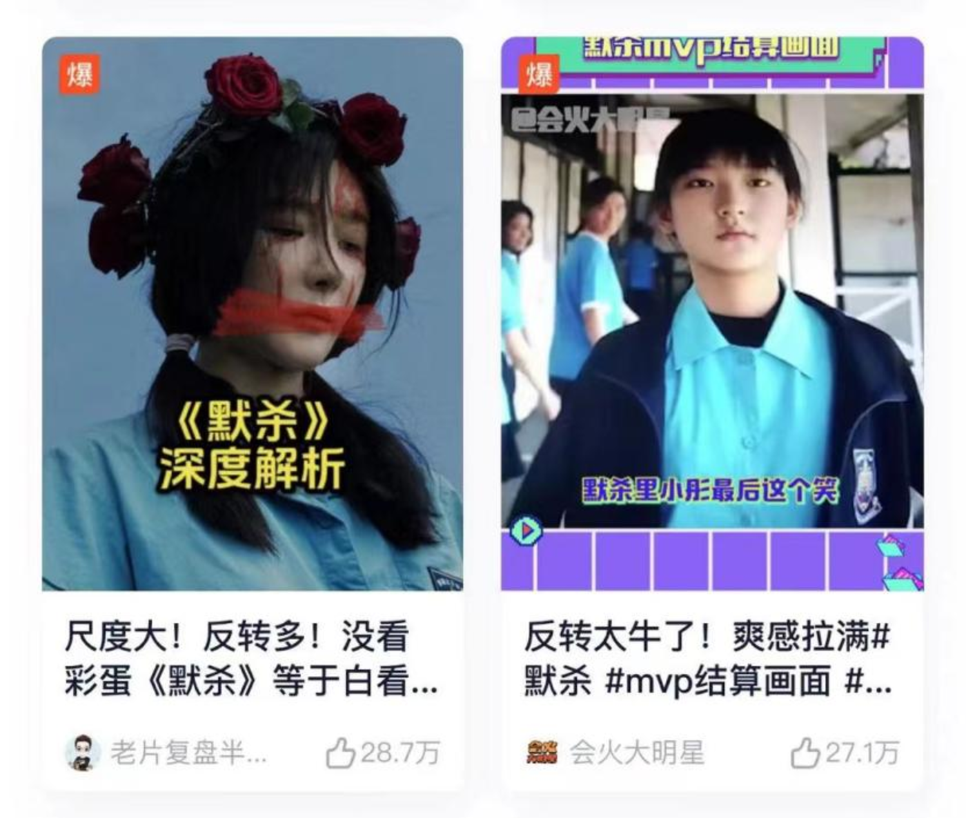 《默杀》找到了这个点。在《默杀》的官方抖音账号数据最好的前五条视频里,有四条都是影片开篇女孩被霸凌用胶水粘在墙上的段落。虽然这些片段的过度泛滥,也已经招致不少网友批评,但从效果而言,的确吸引到了不少观众对它的注意。