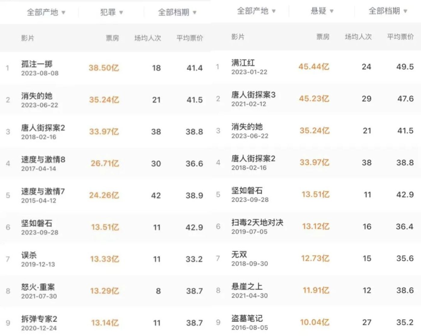 一则是性价比高。除了《唐人街探案》系列之外,鲜少有悬疑犯罪片会选择大制作、高成本的路线,往往都是请片酬相对可控的演员,以中小成本完成制作。但它能撬动的票房想象空间却很大。在去年之前,悬疑犯罪类影片的票房上限几乎徘徊在十亿上下(除去《唐人街探案》系列),但一部《消失的她》,骤然将上限拉升至30亿+。到目前为止,15亿-30亿的区间,悬疑犯罪片也几乎是缺位的状态,亟待有新项目能够补充。