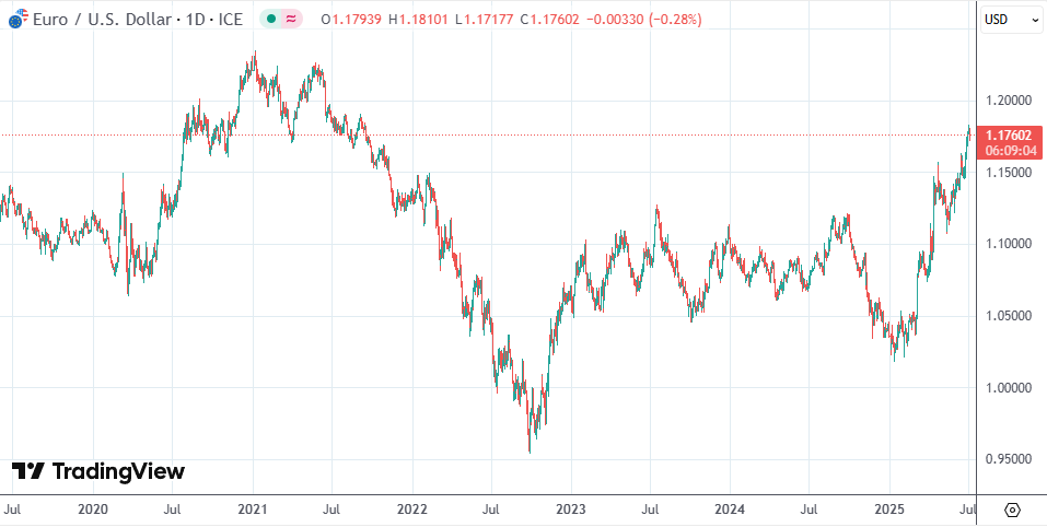 分析认为,投资者为了在美国政策波动中寻求避险,大举转向欧洲资产,令欧元走势出人意料——年初时,市场还曾普遍预测欧元将跌至与美元平价的水平。