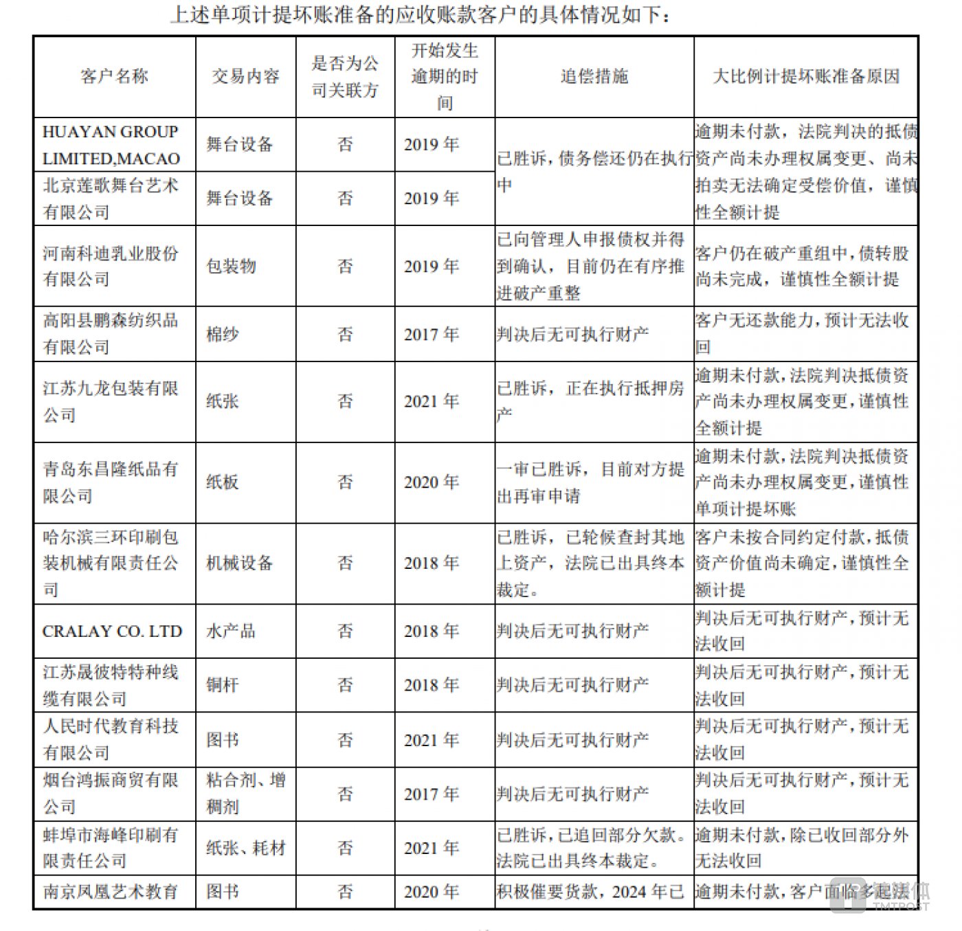 在计提坏账准备的说明里,大部分公司的状态均处在“判决后也无可执行财产,预计无法收回账款”的状态。可见,对于部分应收账款而言,即使公司胜了官司,但面对身无分文的老赖,时代出版仍然无计可施。