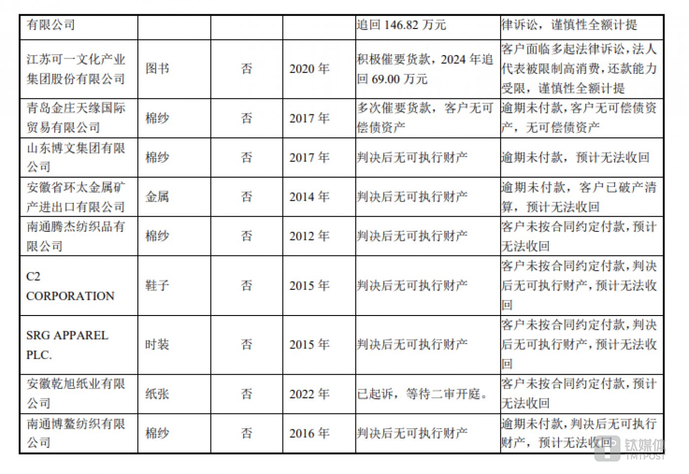2023年末,公司应收账款账面余额9.88亿元,计提坏账准备达到3.28亿元,其中,按单项计提坏账准备的应收账款有1.65亿元,坏账准备计提比例96.38%,值得注意的是,其所列举的22家计提坏账的公司中,只有三家交易内容为“图书”,其他大部分交易的内容均是“纸张、棉纱、耗材”等产品,属于前文所提到的文化贸易行业。