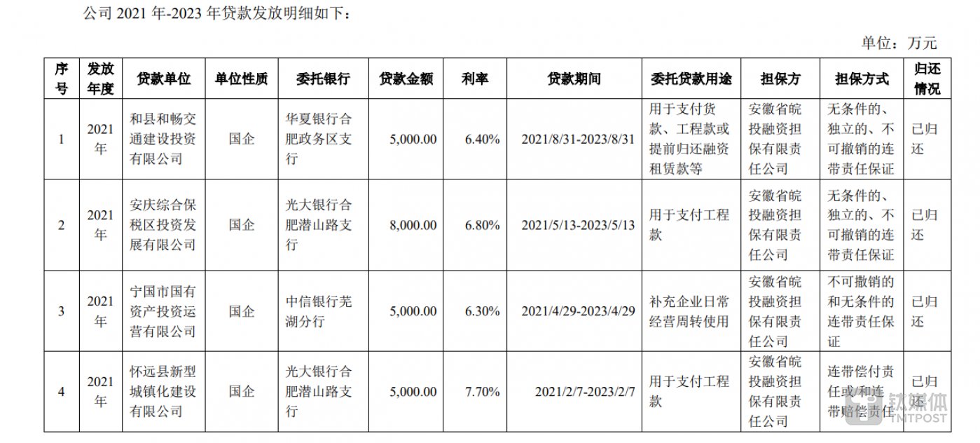 与此同时,公司还涉及了放贷业务。公告显示,2021年至今,公司发放7笔共4.46亿元委托贷款,借款人均为国有企业,贷款利率均高于同期银行存贷款基准利率水平,其中,公司对怀远县新型城镇建设有限公司的贷款利率达到了7.7%。