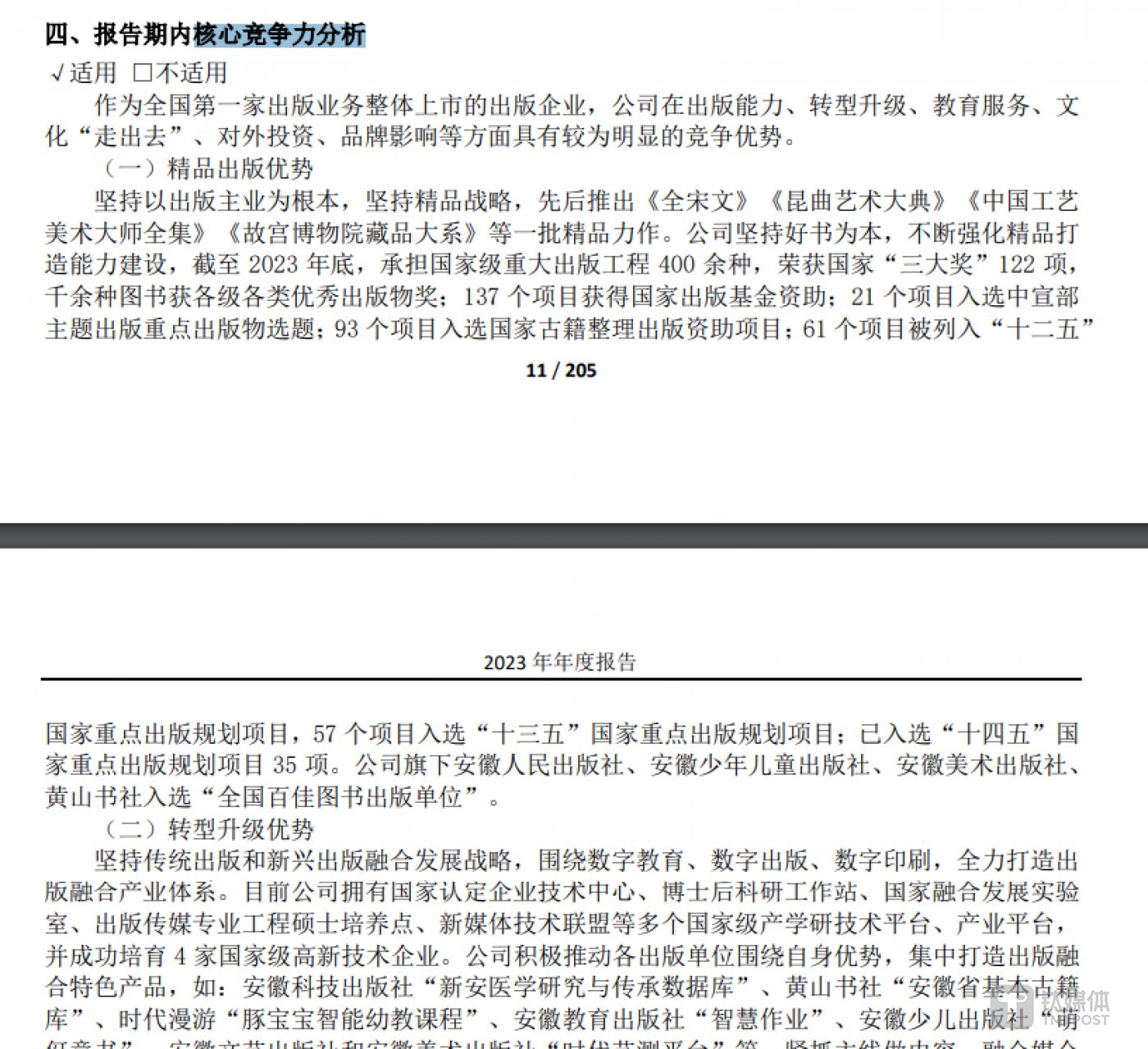 2023年,公司实现营业收入86.43亿元,同比增长13.03%,净利润达到5.55亿元,同比增长61.21%,除去改制文化企业税收优惠政策变化等非经常性因素,时代出版净利润为3.47亿元,同比增长21.9%。公司主要经营指标实现了两位数的增长,并首次入选“全国文化企业30强”。