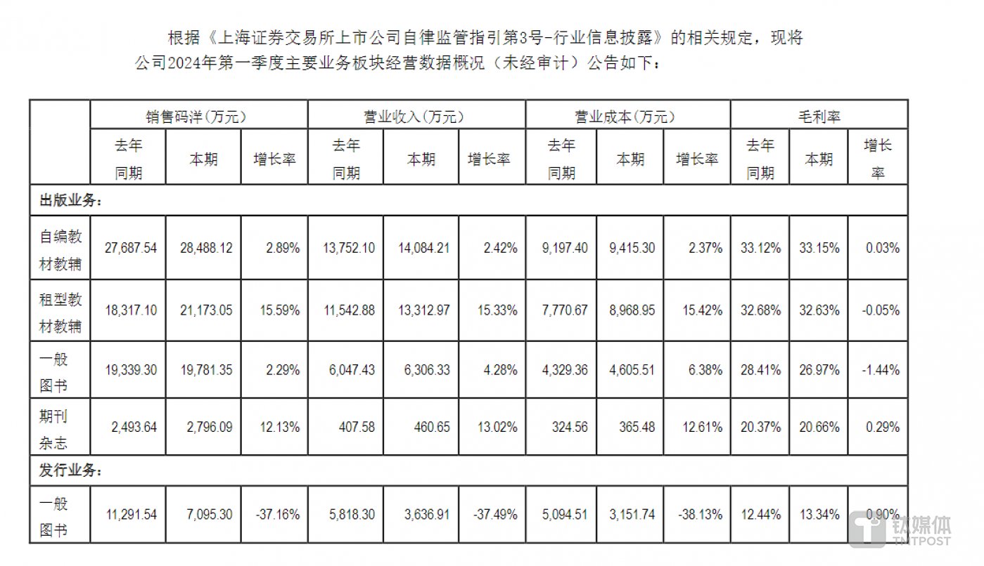 和常规认知不同,时代出版的绝大部分营收依靠印刷物资及文化商品贸易。2021年—2023年,公司贸易业务收入分别为51.88亿元、48.63亿元、56.43亿元,分别占比65.73%、63.61%、65.29%。但蹊跷的是,对于占比如此之大的业务,公司在各报告期的经营数据中却未单独列出,以今年一季度为例,公司也只列出了其出版业务和发行业务的经营数据。