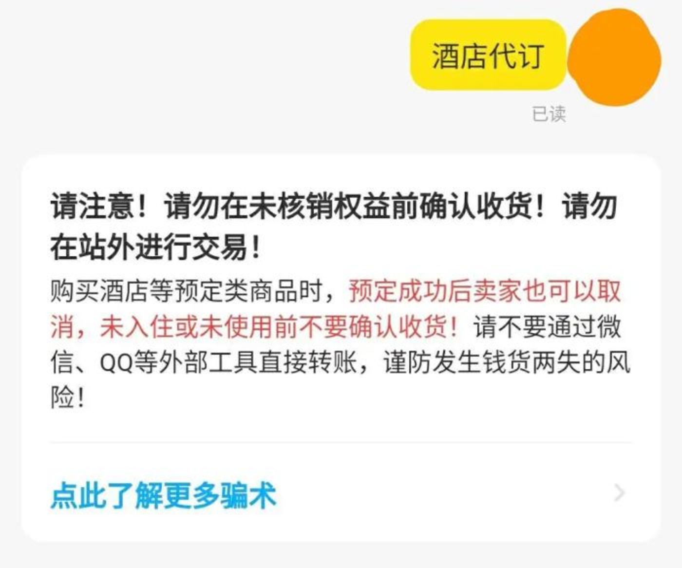 更何况,前述内容提到的“正规交易平台”也无法保证绝对安全。毕竟,许多被信用卡盗刷牵连的游客,正是通过闲鱼上的酒店代订商家完成了预订。一旦盗刷行为暴露,卡主拦截,这些酒店代订商家将关闭交易订单——这就是入住之后发货的用意。
