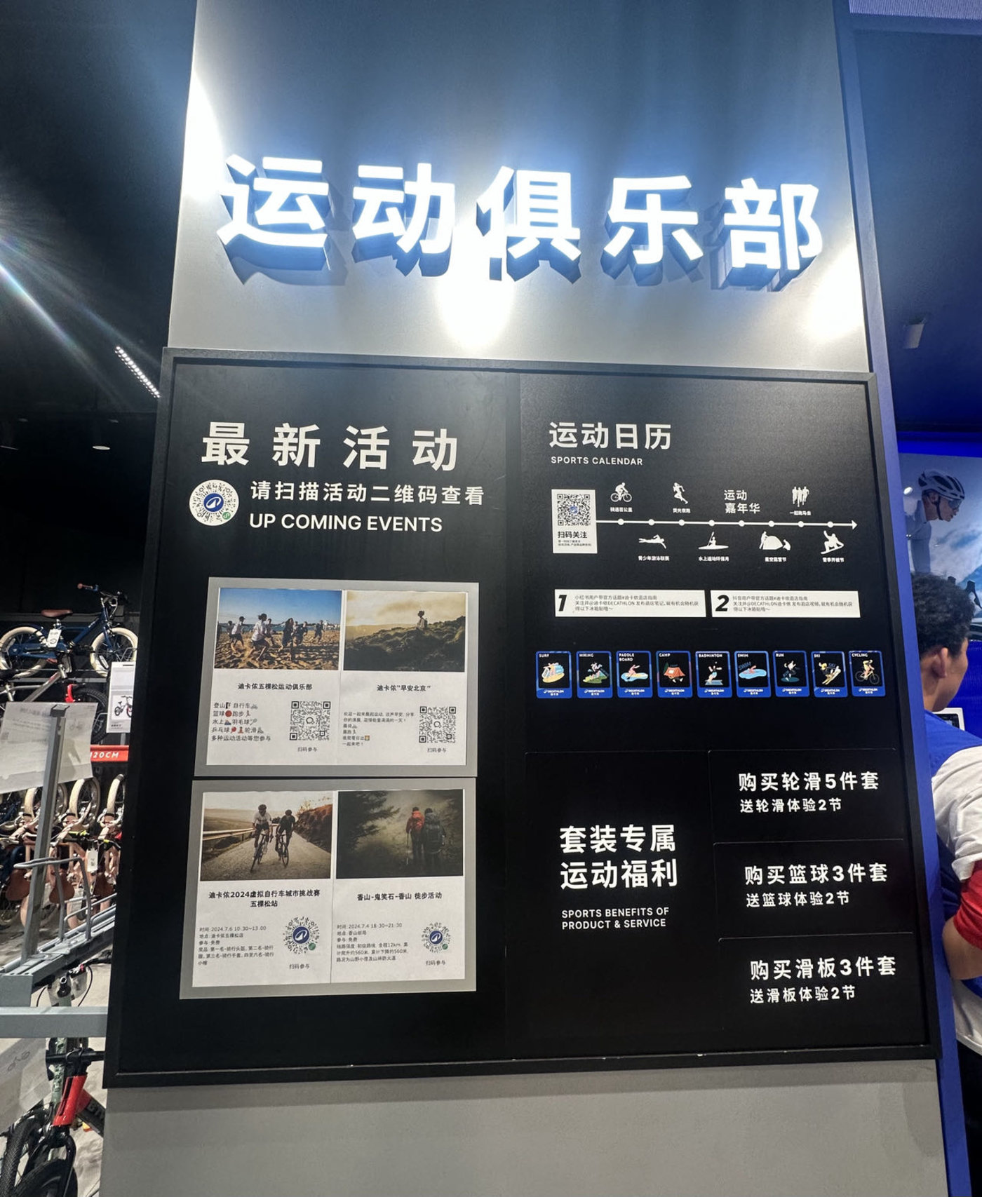 迪卡侬北京五棵松万达广场店门店运营经理李先生告诉古方信息网,“顾客可以通过墙上运动俱乐部的二维码加入我们的运动社群。在过去的开业筹备阶段,我们办过运动进社区,如教周边社区小朋友篮球,足球,跳绳等运动,每周也有各种郊野徒步活动,如香山植物园、夜爬东灵山看日出、麻田岭徒步,也有自行车骑行活动,如长安街骑行、首钢大桥骑行、故宫骑行等。”