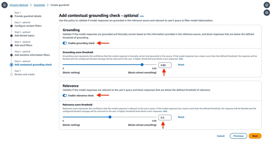 用户现在可以在Amazon Bedrock的Guardrails中设置针对生成结果准确性的关联值,低于这一设定阈值的生成结果就会被Guardrails判定为不相关的幻觉结果并不予显示。这项功能是通过对上下文的基础性检查来提供的,以更好的避免基础模型产生的幻觉问题。