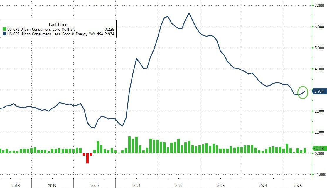 数据显示,6月剔除波动较大的食品和能源成本的核心CPI环比上涨了0.2%,略低于经济学家预期0.3%,但高于5月份的0.1%涨幅。