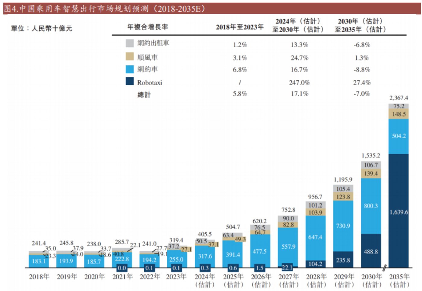 另一方面,更加智能、舒适且实惠的乘车体验,会促使用户的通勤选择进一步向Robotaxi倾斜。根据“自动驾驶运营第一股”如祺出行的招股书数据,Robotaxi在出行市场中所占的比重会逐年增加。预计 2030 年 Robotaxi 在中国智慧出行的渗透率将达到 31.8%,2035 年将达到 69.3%,有望超过网约车、顺风车等其他出行方式。