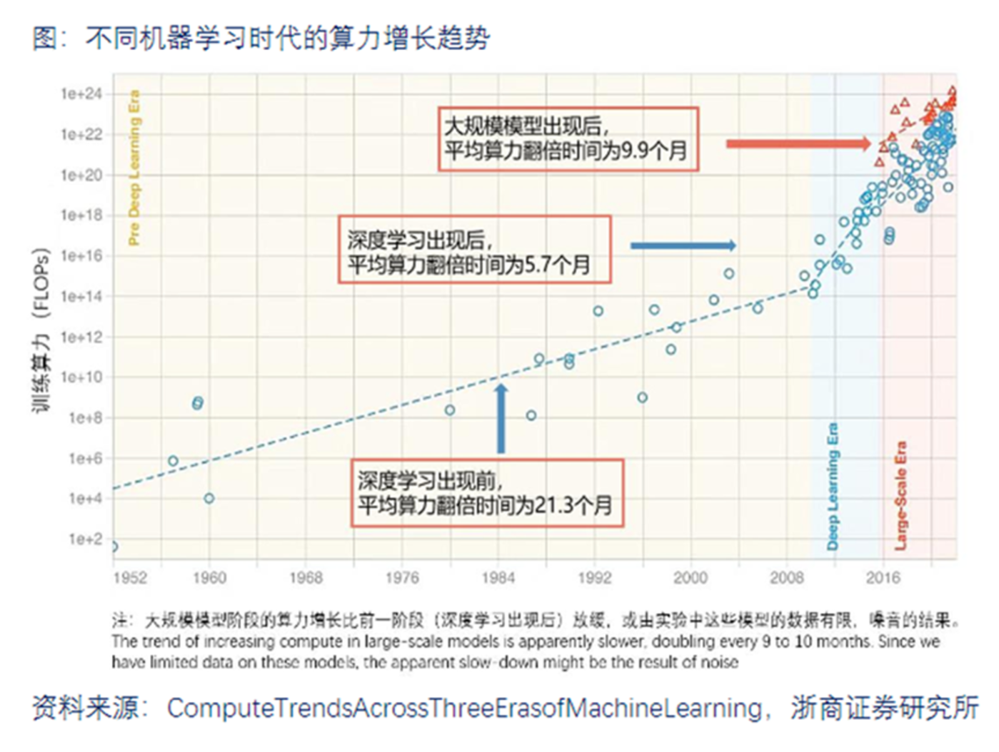 因为算力缺口依然庞大。根据美国银行研究数据指出,AI模型训练所需的算力每2年涨275倍。大模型训练的Scaling Law 依然有效。“源数据”-“Transformer”-“Diffusion”-“涌现”,这条技术路线在短时间内依然是业内铁律。工信部数据显示,2023年中国数字经济核心产业增加值估计超过12万亿元,占GDP的比重为10%左右,算力总规模达230EFLOPS,智能算力规模达70EFLOPS,增速超70%。