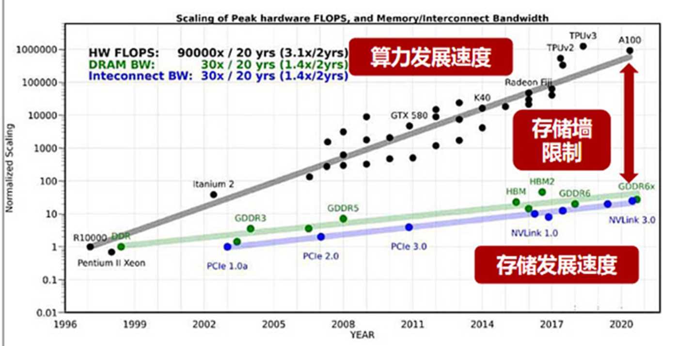 亿铸科技CEO熊大鹏在“2024算力技术创新发展生态大会”上公开表示:“过去20年峰值算力提高了90000倍,但内存带宽仅提高了100倍,互联带宽仅提高了30倍。”