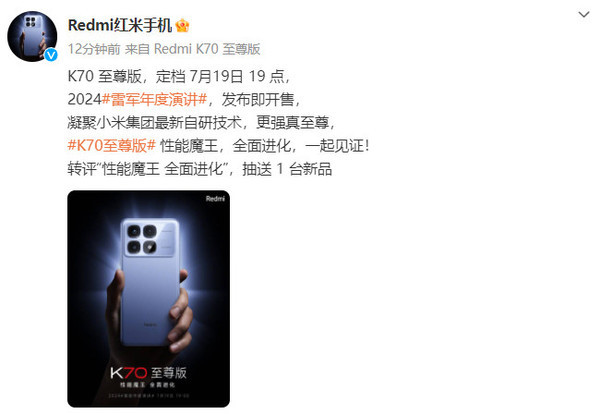 性能魔王来袭!Redmi K70至尊版定档7月19日:凝聚最新自研技术