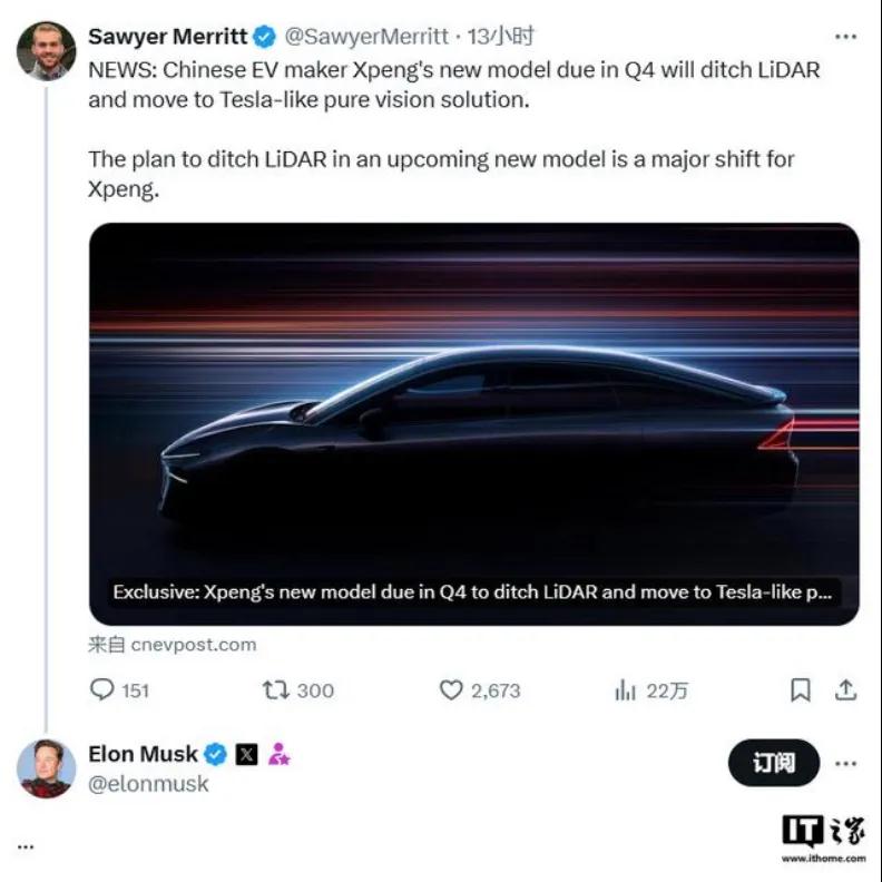何小鹏并未解释何谓“全新的智驾技术方案”,但有报道称,P7+将会采用纯视觉的智驾方案,不再搭载激光雷达。这一技术方案跟特斯拉FSD去年发布的首个“端到端”AI自动驾驶模型FSD Beta V12相似,马斯克本人更在这一报道下点评“…”。