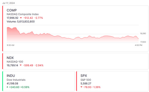 【TechWeb】7月18日消息,据外媒报道,周三美股三大指数收盘涨跌不一,道琼斯工业平均指数报41,198.08点,上涨0.59%;纳斯达克综合指数报17,996.92点,下跌512.42点,跌幅为2.77%;标普500指数报5,588.27点,下跌1.39%。