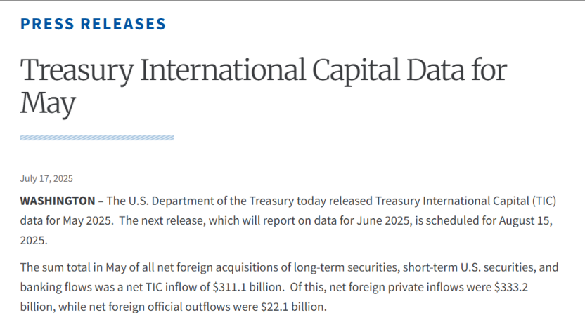 美财政部公布5月国际资本流动报告。