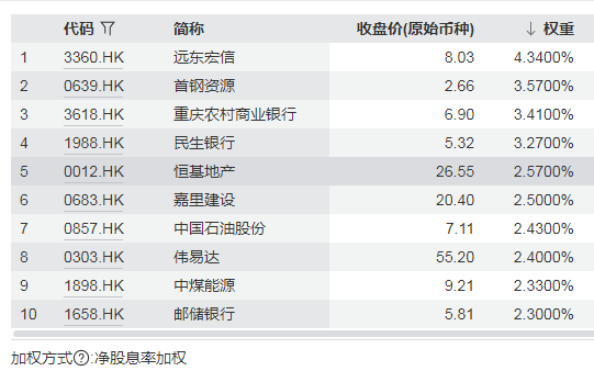 恒生港股通高股息低波动指数主要权重股
