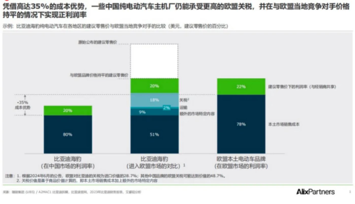 不过,艾睿铂分析显示,中国新能源汽车相比欧洲品牌的成本优势最高可达35%,仍有降价空间,以此抵消部分关税带来的冲击。