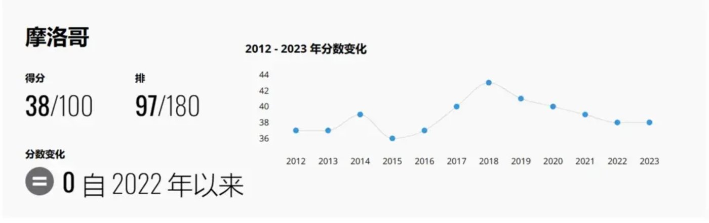根据透明国际(Transparency International)报告的2023年清廉指数,摩洛哥的得分为38分,在180个国家中排名第97位。自2018年以来,摩洛哥的清廉指数持续走低。“摩洛哥政府部门官员腐败现象比较普遍,政策执行不力;且王室与政府间的关系盘根错节,企业落地摩洛哥,后期的隐性成本会比较高昂。”欣孚智库的创始人宋欣告诉霞光社。