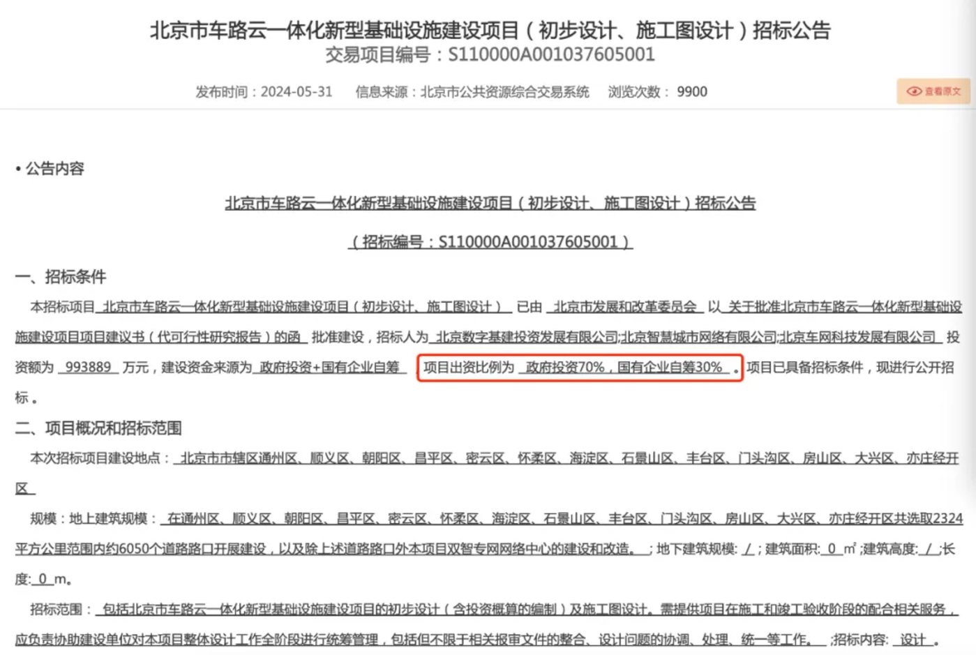 如,北京市车路云一体化新型基础设施建设项目中明确,项目建设资金来源为“政府投资+国有企业自筹”,项目出资比例为政府投资70%、国有企业自筹30%。